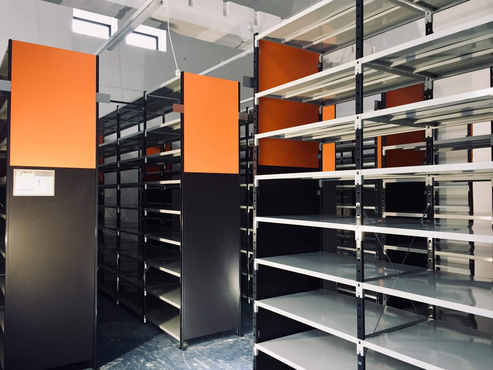 Rayonnages légers avec tablettes métaliques peintes pour le stockage d'archives dans une administration à Villefranche sur Saône